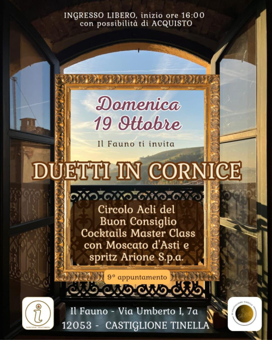 Domenica 19 ottobre al Fauno di via Umberto I a Castiglione Tinella va in scena il nono appuntamento con i “Duetti in cornice” dedicati in modo particolare ai produttori del paese e del territorio, che renderanno protagonisti in questa occasione il Circolo ACLI del Buon Consiglio - gestito da giovani castiglionesi che si occupano di organizzare diverse attività per la comunità e per i visitatori - e l’azienda vinicola castiglionese Arione SpA: insieme le due realtà, che già collaborano attivamente, proporranno agli intervenuti aperitivi al Moscato d’Asti e Spritz. Un appuntamento dal carattere gustoso e rinfrescante. Da non perdere. Ingresso libero a partire dalle ore 16, con possibilità d’acquisto.