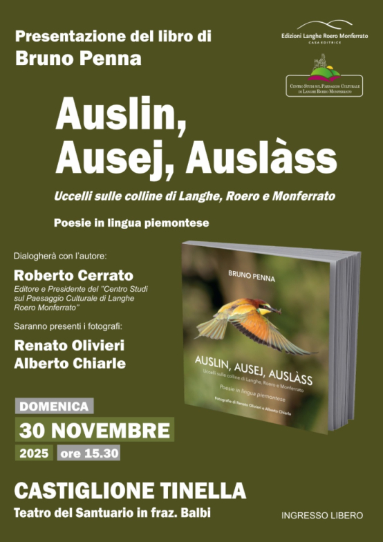 Dopo la prima ufficiale di Alba, il nuovo libro di Bruno Penna viene ora presentato nel suo paese, Castiglione Tinella, nel luogo dove i testi del volume sono stati scritti e dove l’autore ha sempre coltivato la sua passione di Birdwatcher.
