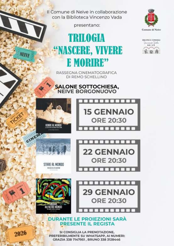 Nel salone sottochiesa di Neive Borgonuovo dal 15 al 29 gennaio la rassegna cinematografica di Remo Schellino" Nascere, Vivere e Morire".